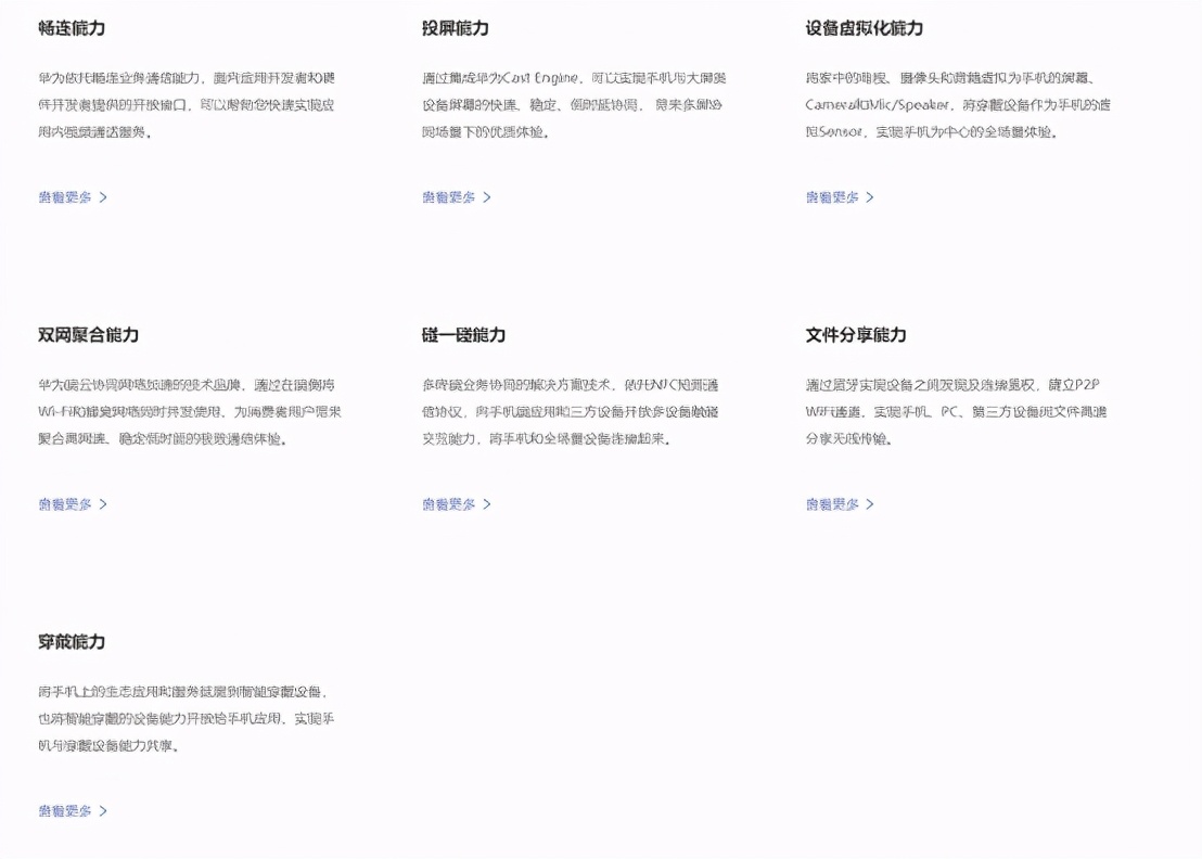 我们在华为的开发平台上可以看到一些 kit 和鸿蒙有关的有设备虚拟化、HiCar、HiLink、碰一碰等。