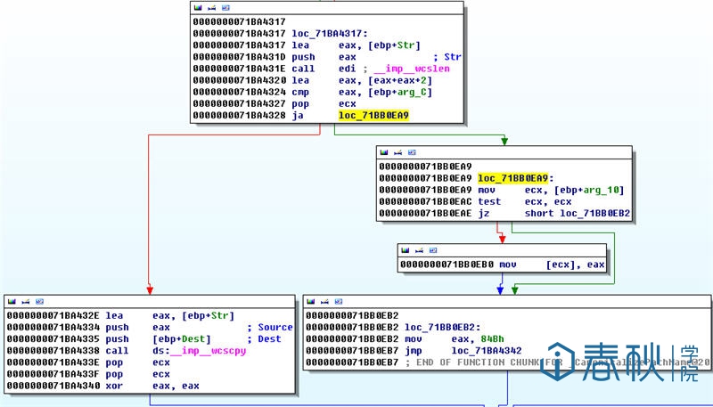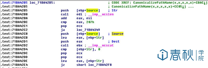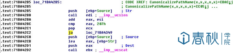 在上图中,位于0x71BA431E处的wcslen用于计算合并后的路径字符串的长度,注意这个长度是