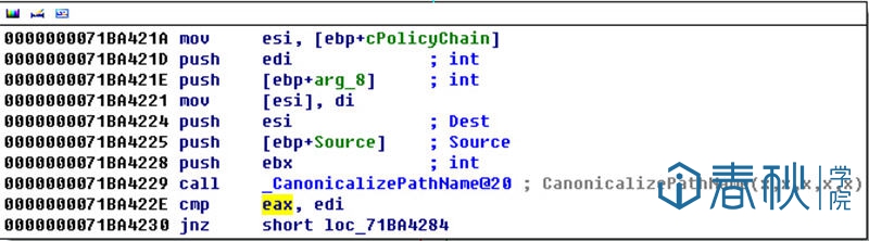 由上图可见,当CanonicalizePathName()调用完毕后,程序会对其返回值(保存在eax中)进
