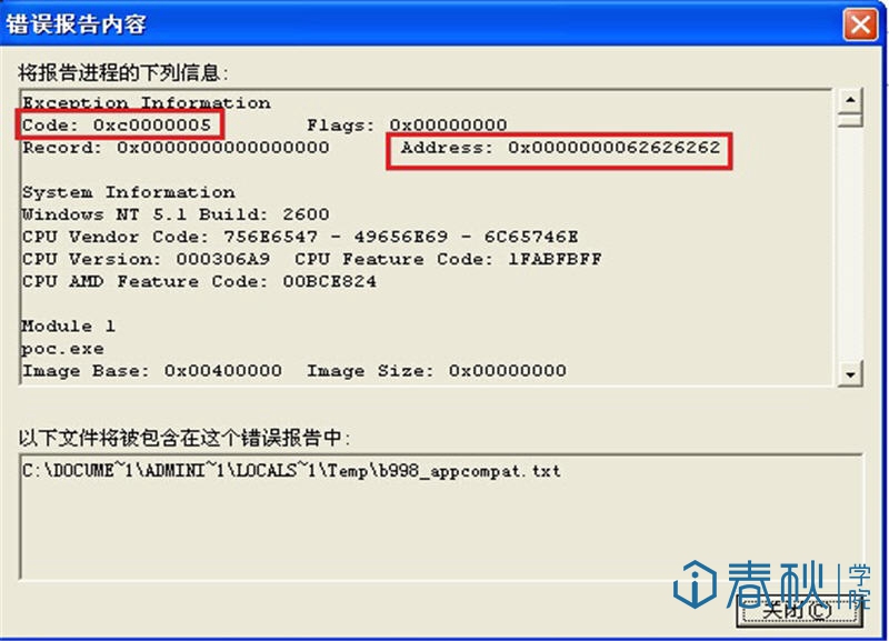 可见这里出现了缓冲区溢出的错误,溢出地址为0x62626262,也就是小写字母“b”。那么我