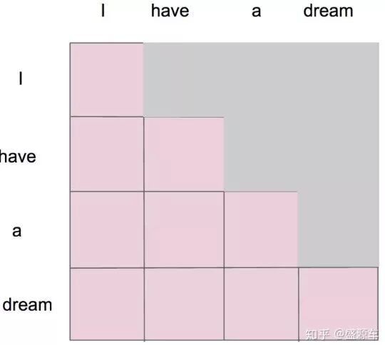 详细来说,i作为第一个单词,只能有和i自己的attention。have作为第二个单词,有和i, have 两个attention。 a 作为第三个单词,有和i,have,a 前面三个单词的attention。到了最后一个单词dream的时候,才有对整个句子4个单词的attention。