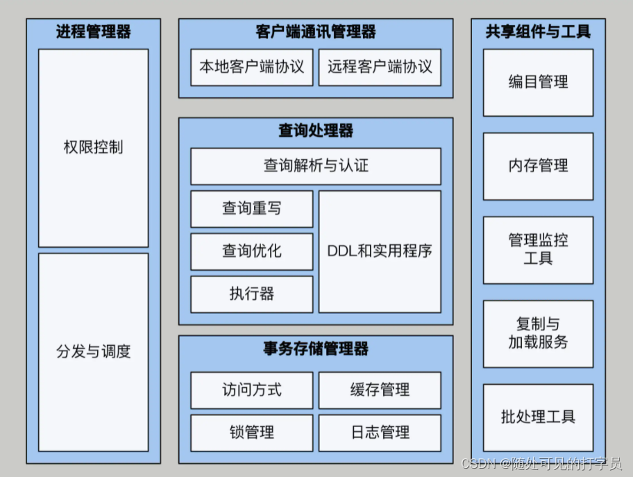 - 进程管理器。数据库为客户端分配的进程,客户端后续的所有操作通过对应的进程执行(Oracle和PostgreSQL使用进程方式,MySQL使用线程)。