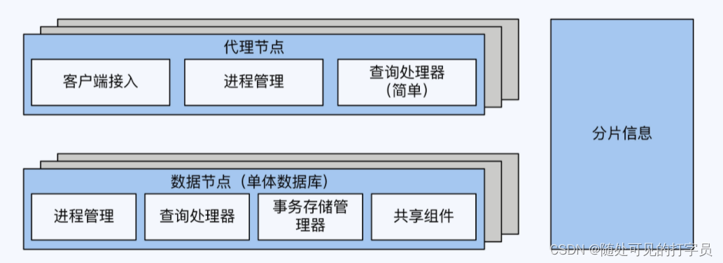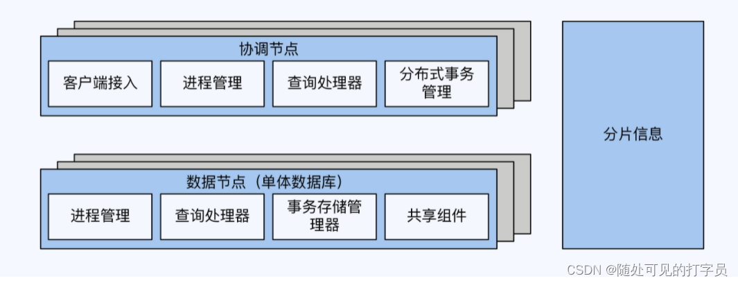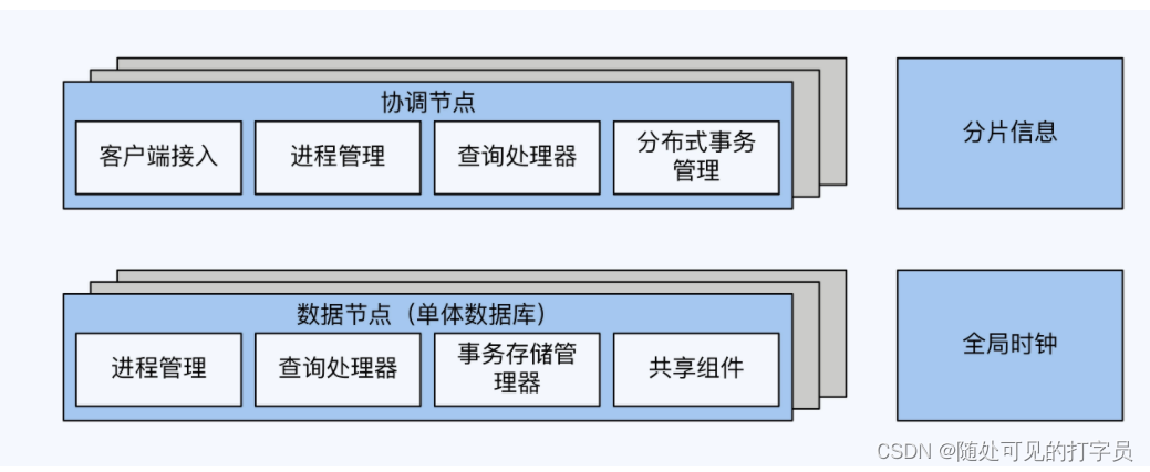 - 架构上,数据库分为:客户端通讯管理器、进程管理器、查询处理器、事务存储管理器和共享组件与工具。分布式数据库在此基础上增加四个主要功能:分片信息管理、分布式事务管理、跨节点查询和全局时钟。