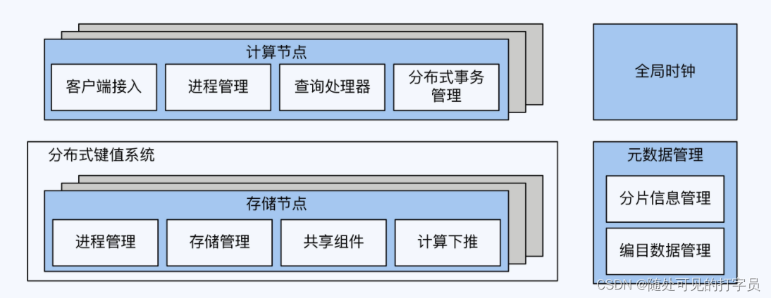 - NewSQL架构是原生分布式数据库。从分布式键值系统演进而来,主要的工作负载由计算节点和存储节点承担,另外由管理节点承担全局时钟和分片信息管理功能。不过,这三类节点是逻辑功能划分,在设计实现层面是可分可合的。比如,TiDB是分为独立节点,CockroachDB是对等的P2P架构。