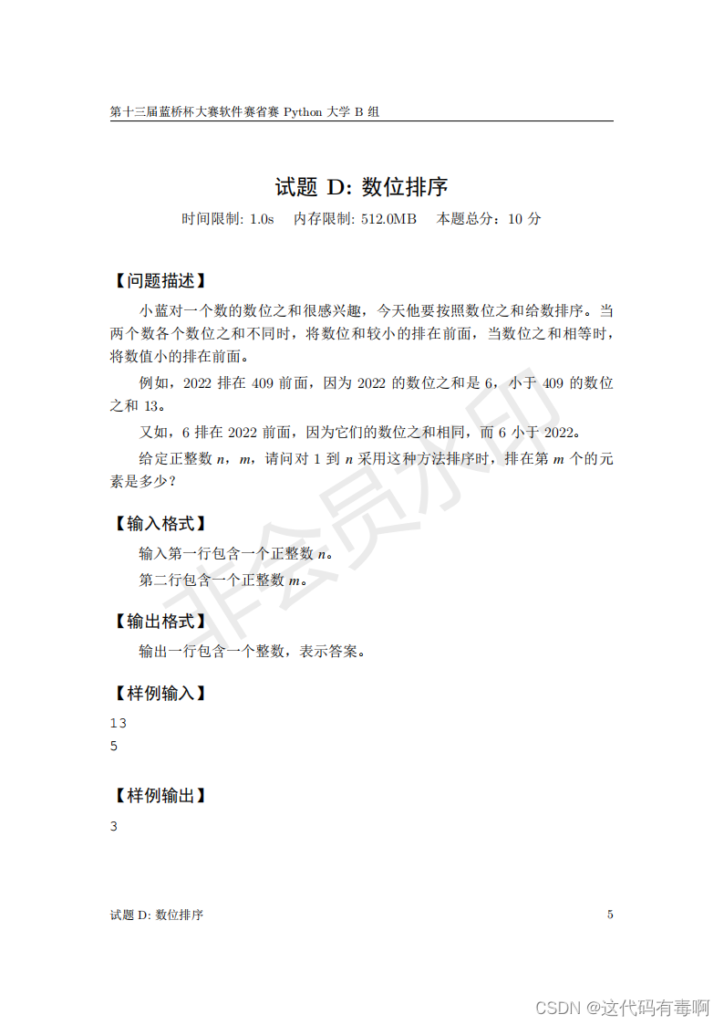 数位排序 小蓝对一个数的数位之和很感兴趣,今天他要按照数位之和给数排序. 当两个数各个数位之和不同时,将数位和较小的排在前面,当数位之和相等时,将数值小的排在前面. 例如,\(2022\) 排在 \( ...