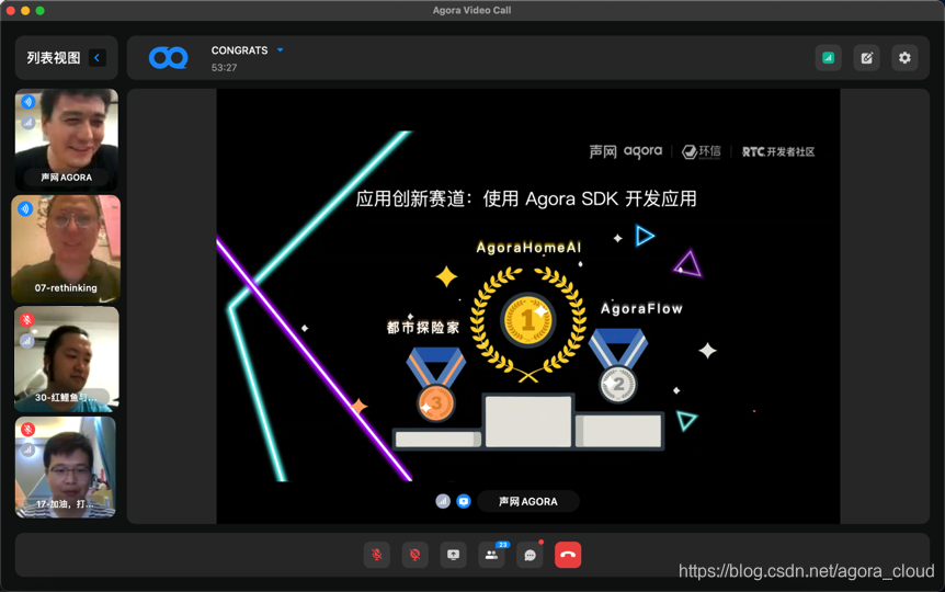 本次大赛的决赛和颁奖都是通过 Agora Video Call App 在线上进行的,全程通过 B 站进行了直播。 最终,决赛共诞生了应用创新赛道的一、二、三等奖团队各一名,“环信专项奖”一名,以及“优秀奖” 六名;技术创新赛道“技术创新专项奖”一名,“优秀奖”一名。 决赛详情可点击查看:有“声”聚一堂|RTE 2021 编程挑战赛圆满收官