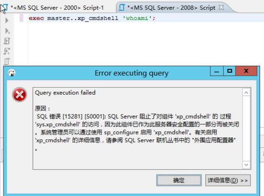 xp_cmdshell存储过程在 SQL Server 2005以后默认关闭,需要手动开启