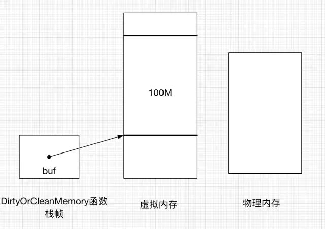 这个时候buf指向的100M内存区域是Clean Memory的,因为操作系统是很懒的,只有当我们要用到这块区域的时候才会映射到物理内存,没有使用的时候只会分配一块虚拟内存给buf。读起来很绕口,上张图: