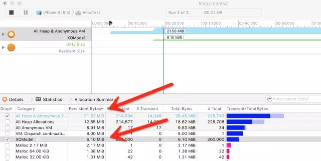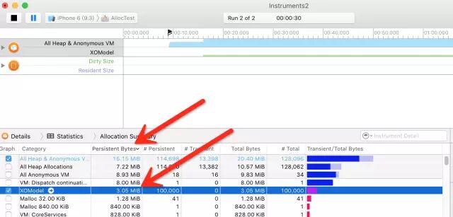 我们可以修改一下触发的代码,然后重新刷新instrument查看XOModel大小,具体操作同上,不重复了: