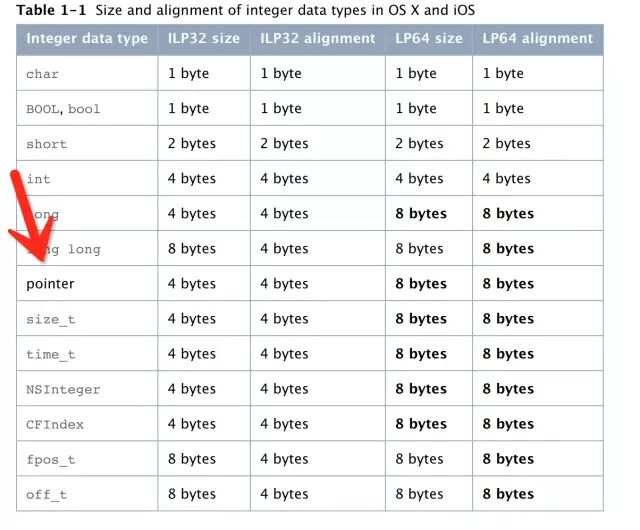 第二点贴个文档图,iOS7过后部分苹果机就开始从32位操作系统转到64位了,所以部分数据类型的大小也有变化,这里我们主要关注例子中的指针: