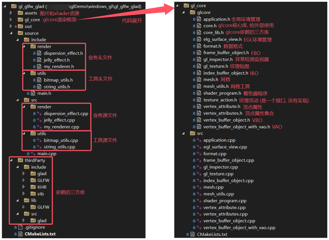 之所以要单独拎出 core_lib.h,是为了方便将该框架迁移到其他平台,如 Android 上依赖的三方渲染库是 EGL + GLESv3,如果不抽出 core_lib.h,就需要将很多地方的 glfw3.h + glad.h 改为 egl.h + gl3.h ,工作量大,也容易漏改。另外,还可以很方便地替换渲染环境,如将 glfw3.h + glad.h 替换为 freeglut.h + glew.h。