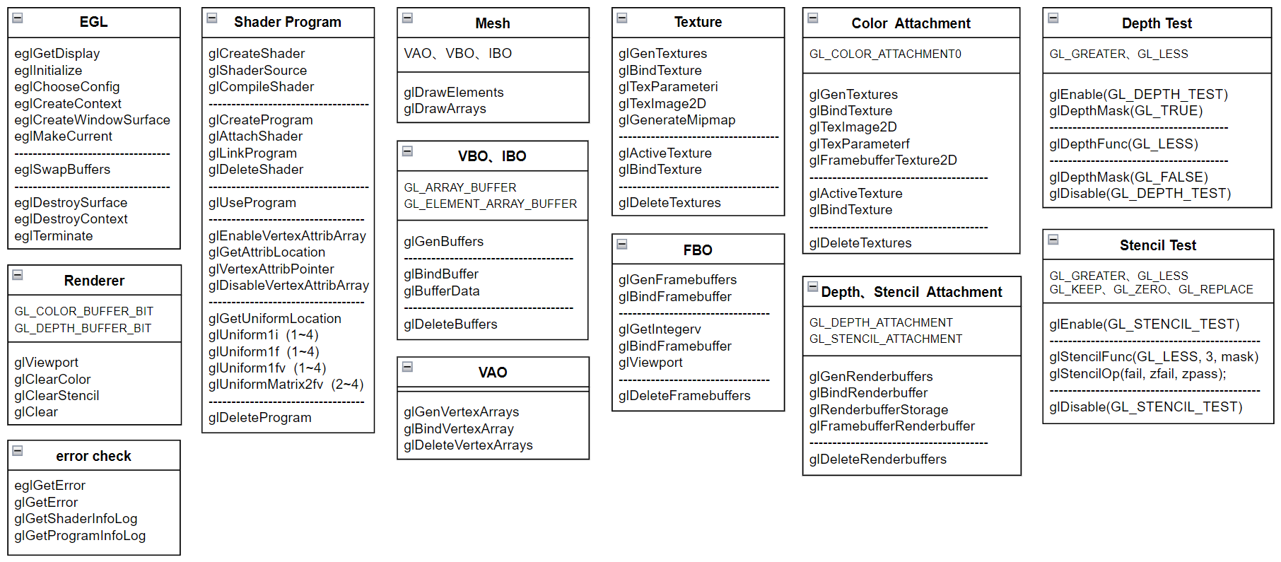 一个 mini 版的渲染框架需要对 OpenGL ES 的常用指令进行归类(如下图),封装 EGL、error check、Shader Program、Mesh、VAO、VBO、IBO、Texture、FBO 等类,方便开发者快速开发渲染程序,将更多的注意力聚焦在业务上,而不是如何去组织 OpenGL ES 指令上。