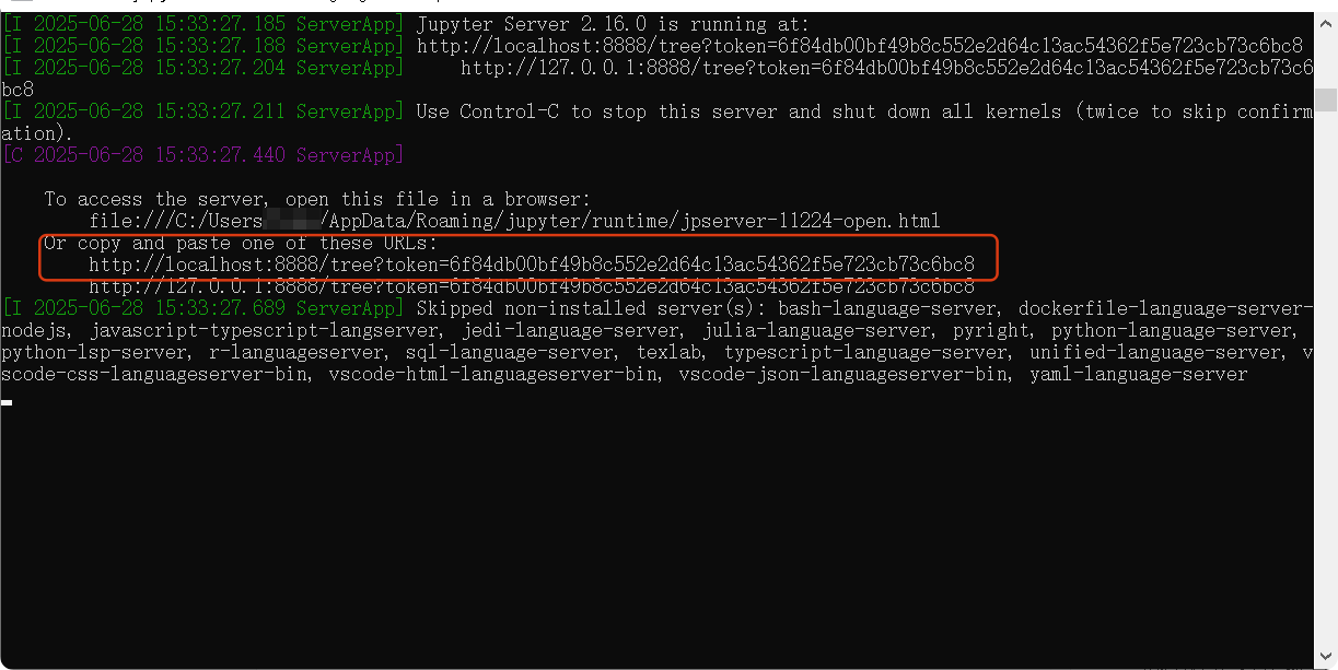 在虚拟环境下启动jupyter,指定数据和代码存储路径(F:\DeepseekCode\),启动成功后一般会自动打开web交互页面,如果没有就自己打开浏览器输入地址,默认地址端口是http://localhost:8888/,可以根据启动信息查看到访问地址、端口和登录token信息。