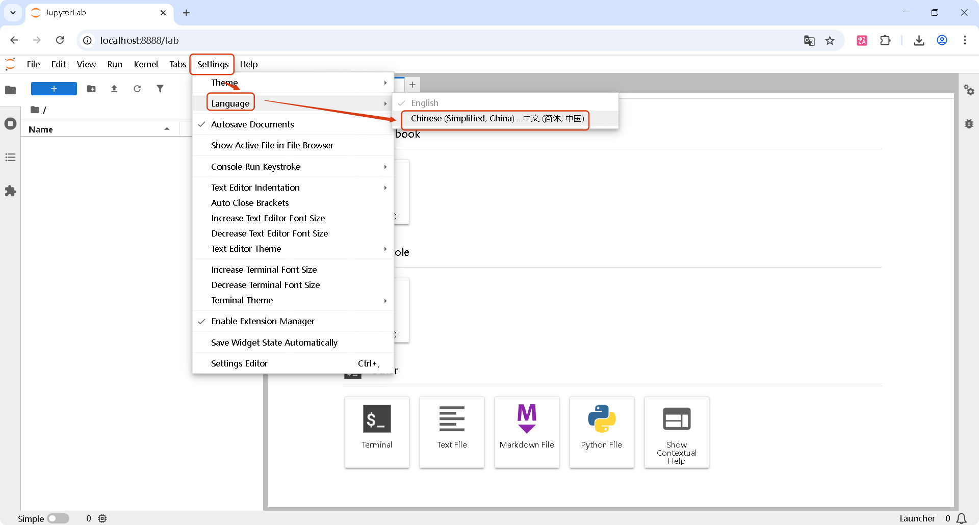 登录jupyter页面后点击Setting->language->选择中文就可以切换到中文界面,点击之后有个提示框,选择“change and reload”自动重新加载页面就可以了。