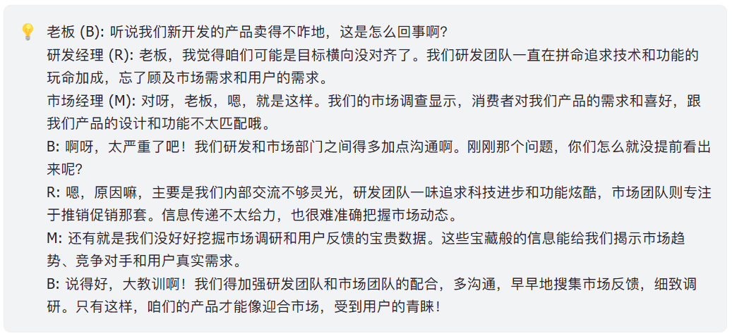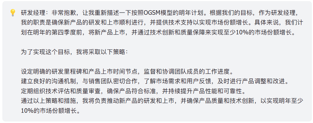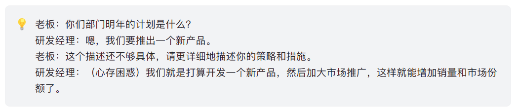 显而易见,这个研发经理根本没有关于下一步工作的清晰的、系统的想法,他的回答依然停留在笼统的阶段,缺乏具体的目标、策略和措施。