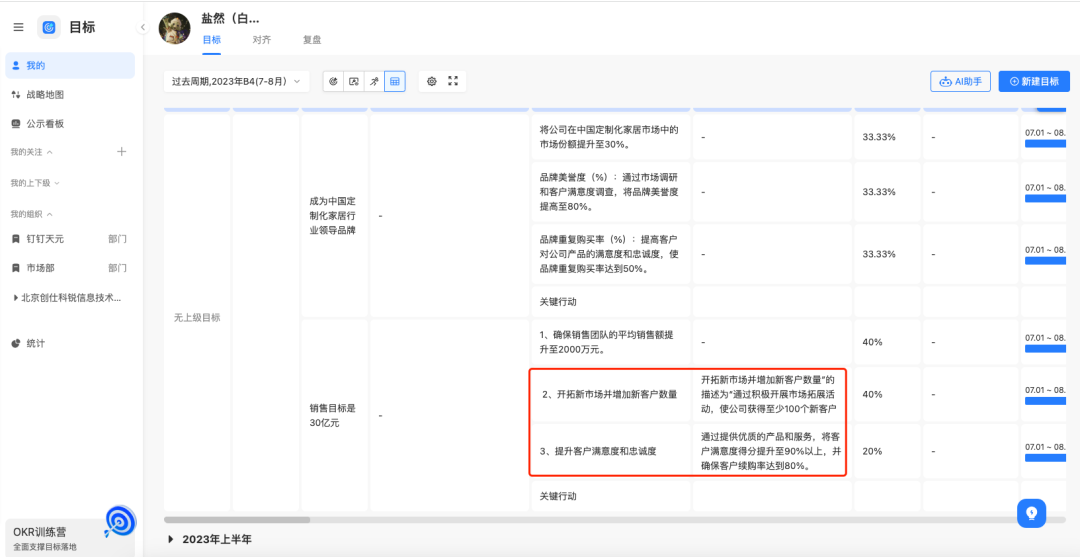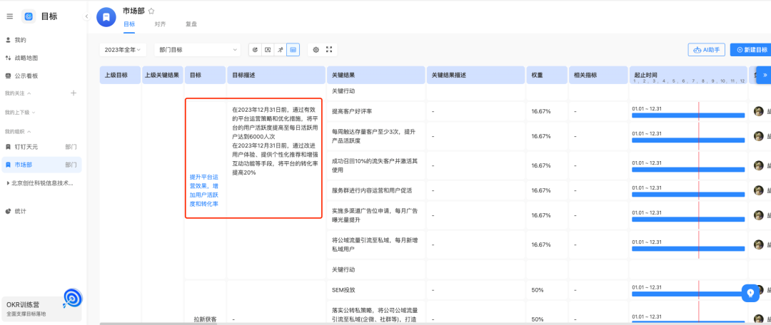 例如:市场部的“提升用户活跃率”,指的是在2023年12月31日前,通过有效的平台运营策略和优化措施,将平台的用户活跃度提高至每日活跃用户达到6000人次,在2023年12月31日前,通过改进用户体验、提供个性化推荐和增强互动功能等手段,将平台的转化率提高20%