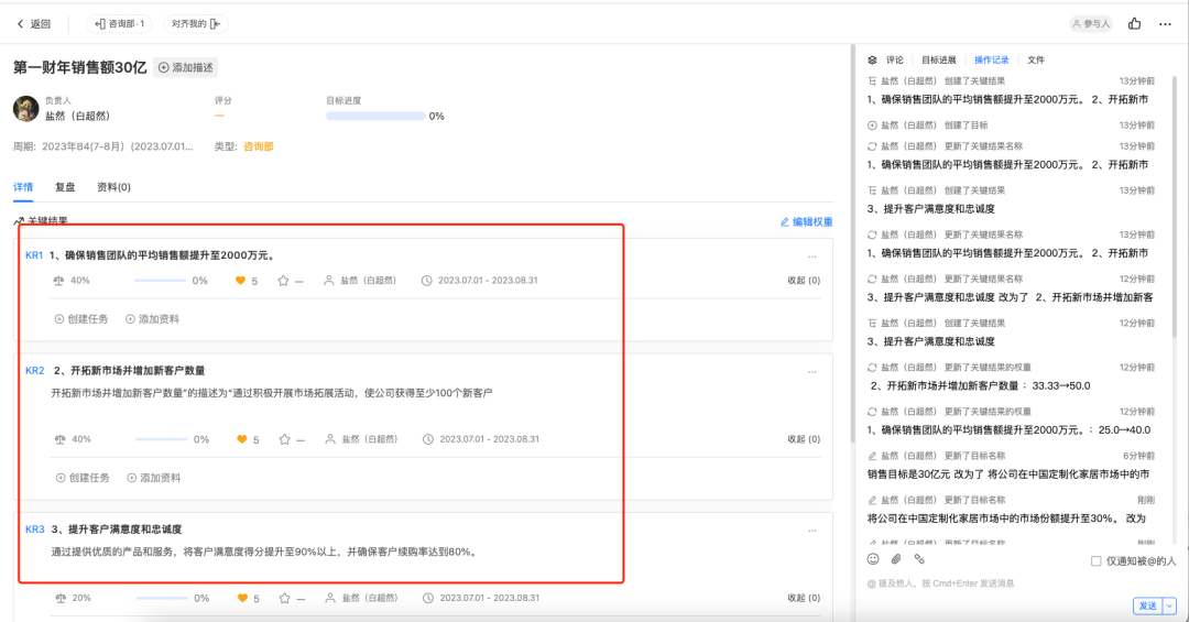 策略即实现目标的路径。在日事清中可以用【关键结果】来制定,一般情况下,一个目标需要有3个策略来支持,也有特殊情况下大于或小于3个的情况。策略应该清晰明确,以便于衡量和评估,以确保策略的描述具有可量化的指标。