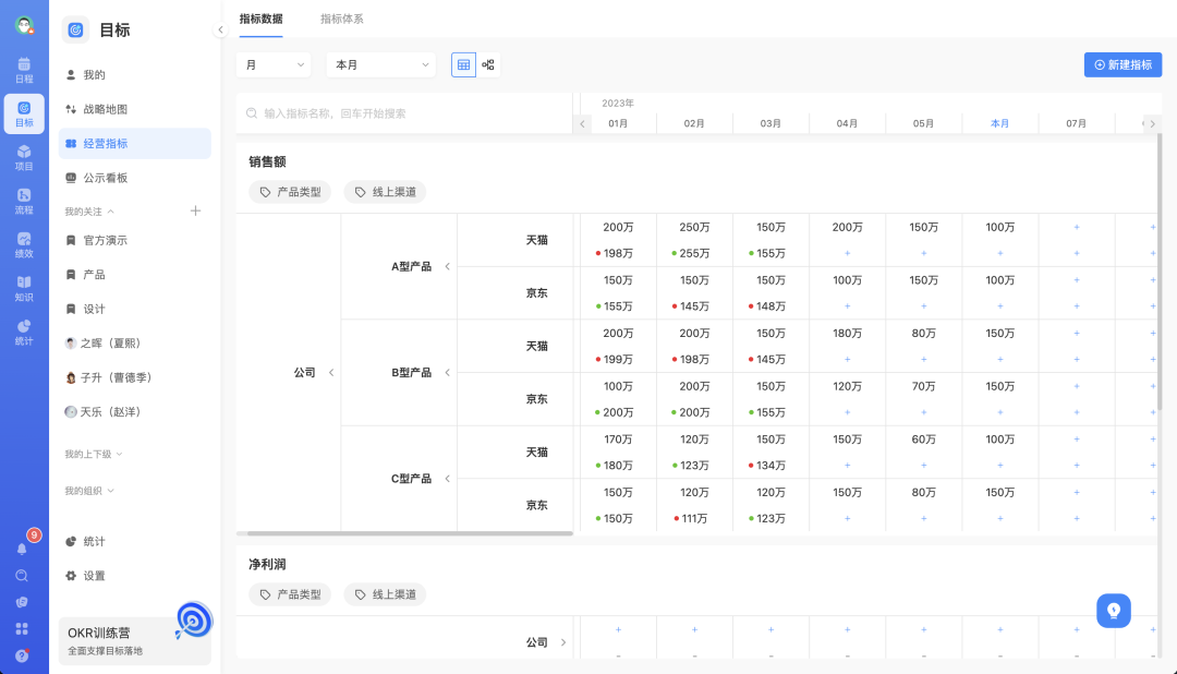日事清的【经营指标】功能是目标内一个独创的功能,可以帮助企业实现OKR战略目标中业绩指标相关目标的跟踪,对企业销售额、净利润等经营指标进行可视化展示、拆解和管理。