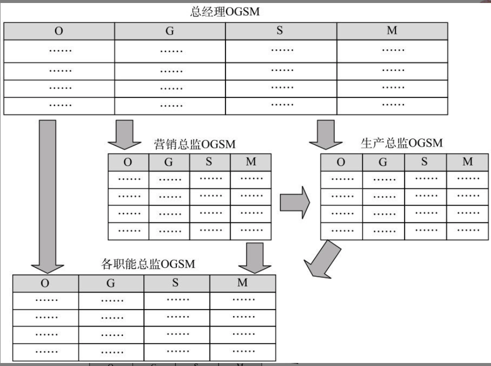 OGSM是一个由上到下逐级分解的过程,同时也是一个由下到上的验证过程。每个层级的管理者,从总裁、副总裁、总监、经理、主管到员工,都有属于自己层级的OGSM。