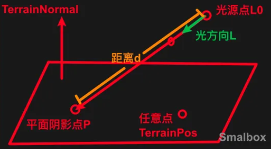 光源点L0,光源方向L,光源距离要投影的的平面距离d;要投影的平面的向上法线向量TerrainNormal,平面上的任意点TerrainPos;现在要计算出光源投向空间中模型上的点在平面上的平面投影点坐标P。