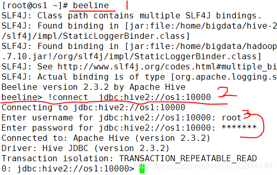 3.3.4) 启动beeline ,然后输出!connect jdbc:hive2://os1:10000,输入用户名和密码