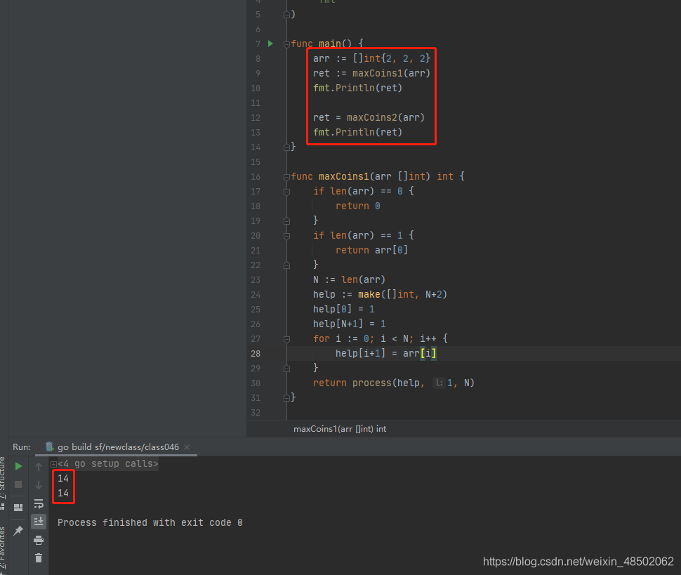 2021-04-29:给定一个数组 arr,代表一排有分数的气球。每打爆一个气球都能获得分数,假设打爆气 球 的分数为 X,获得分数的规则如下: 1)如果被打爆气球的左边有没被打爆的气球,找到离被打爆气球最近的气球,假设分数为 L;如果被打爆气球的右边有没被打爆的气球,找到离被打爆气球最近的气球,假设分数为 R。 获得分数为 LXR。 2)如果被打爆气球的左边有没被打爆的气球,找到离被打爆气球最近的气球,假设分数为 L;如果被打爆气球的右边所有气球都已经被打爆。获得分数为 LX。 3)如果被打爆气球的左边所有的气球都已经被打爆;如果被打爆气球的右边有没被打爆的 气球,找到离被打爆气球最近的气球,假设分数为 R;如果被打爆气球的右边所有气球都 已经 被打爆。获得分数为 XR。 4)如果被打爆气球的左边和右边所有的气球都已经被打爆。获得分数为 X。目标是打爆所有气球,获得每次打爆的分数。通过选择打爆气球的顺序,可以得到不同的总分,请返回能获得的最大分数。【举例】arr = {3,2,5} 如果先打爆3,获得32;再打爆2,获得25;最后打爆5,获得5;最后总分21 如果先打爆3,获得32;再打爆5,获得25;最后打爆2,获得2;最后总分18 如果先打爆2,获得325;再打爆3,获得35;最后打爆5,获得5;最后总分50 如果先打爆2,获得325;再打爆5,获得35;最后打爆3,获得3;最后总分48 如果先打爆5,获得25;再打爆3,获得32;最后打爆2,获得2;最后总分18 如果先打爆5,获得25;再打爆2,获得32;最后打爆3,获得3;最后总分19 返回能获得的最大分数为50。