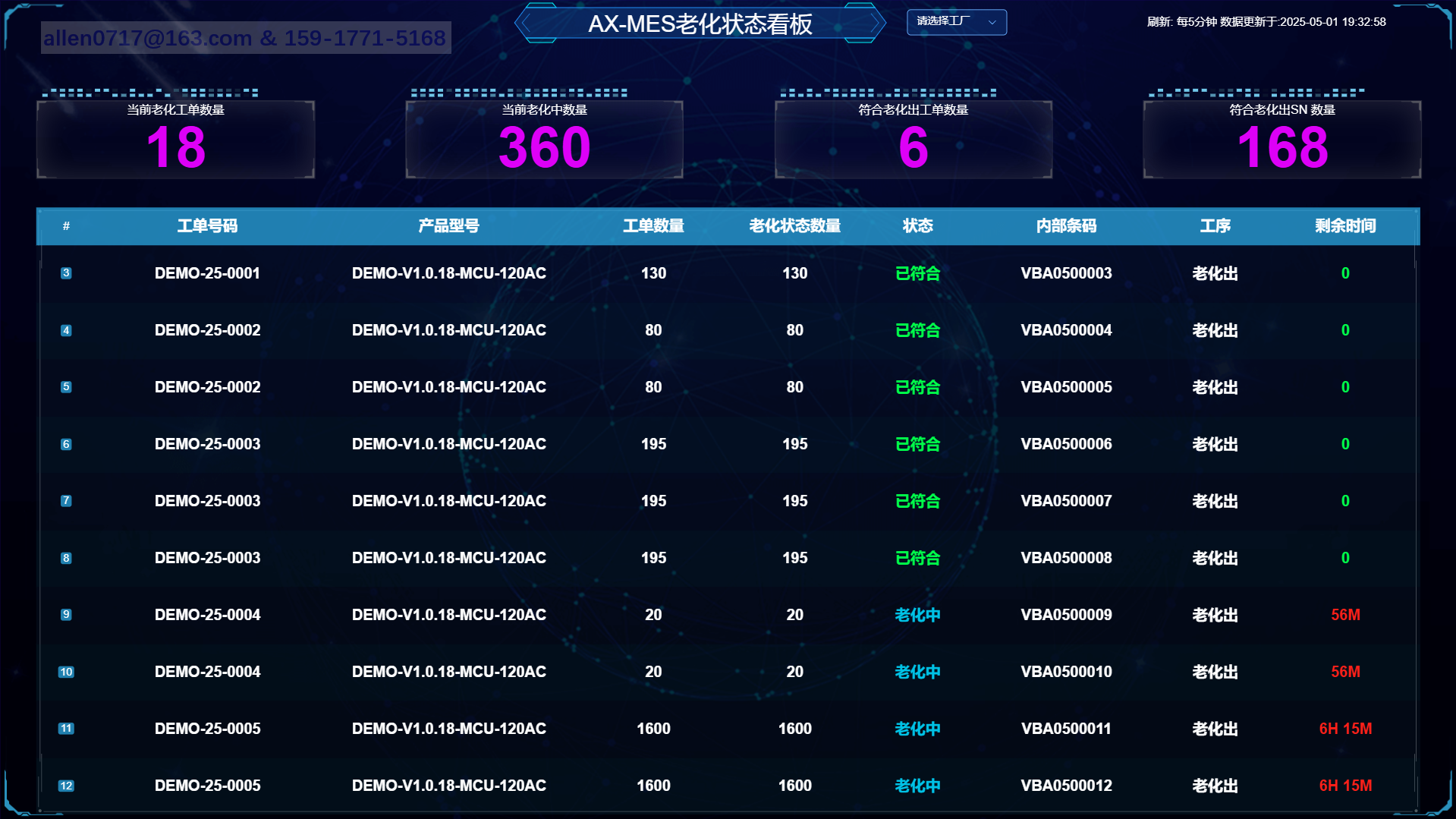 通过 MES 老化状态看板可以实时滚动显示已经做完老化进还未老化出的产品剩余老化时间,方便我们及时了解老化状态!