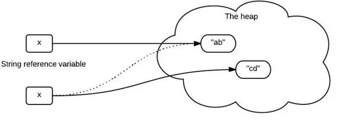 x 存储了堆中"ab"字符串的引用。因此,当x作为参数传递到change()方法的时候,它仍然堆中的"ab",如下所示: