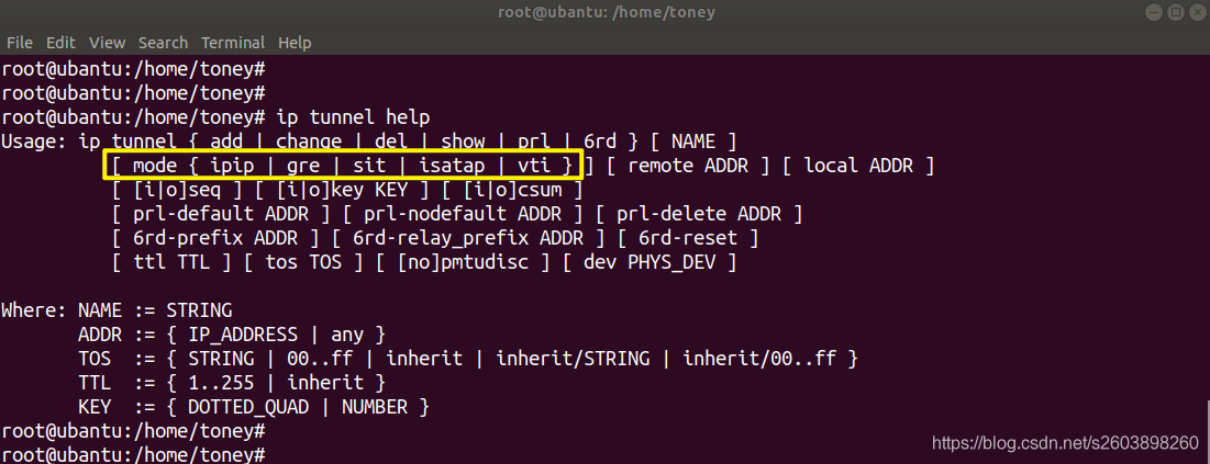 root@ubantu:/home/toney# ip tunnel add Tunnel-1 mode gre