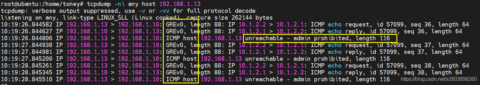这里有一点需要注意:Linux系统可能开了iptables过滤功能,因此在ping时出现了类似" ICMP host 192.168.1.13 unreachable - admin prohibited, length 116"信息,详情如下: