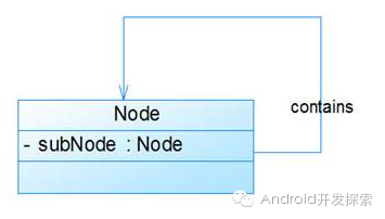 自关联在UML类图中用一个带有箭头且指向自身的直线表示。上图的意思就是Node类包含类型为Node的成员变量,也就是“自己包含自己”。