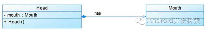 显然,嘴是头的一部分且不能脱离了头而单独存在。在UML类图中,组合关系用一个带实心菱形和箭头的直线表示。