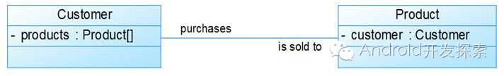 从上图中我们很容易看出,所谓的双向关联就是双方各自持有对方类型的成员变量。在UML类图中,双向关联用一个不带箭头的直线来表示。上图中在Customer类中维护一个Product[]数组表示一个顾客购买了哪些产品;在Product类中维护一个Customer类型的成员变量表示这个产品被那个顾客所购买。