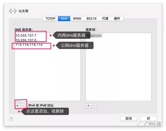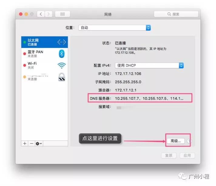 上面的截图显示小程使用的dns服务器是10.255.107.7(默认端口53),这个dns服务器在哪里设置呢?小程是mac机,在网络设置里面,可以设置,看截图: