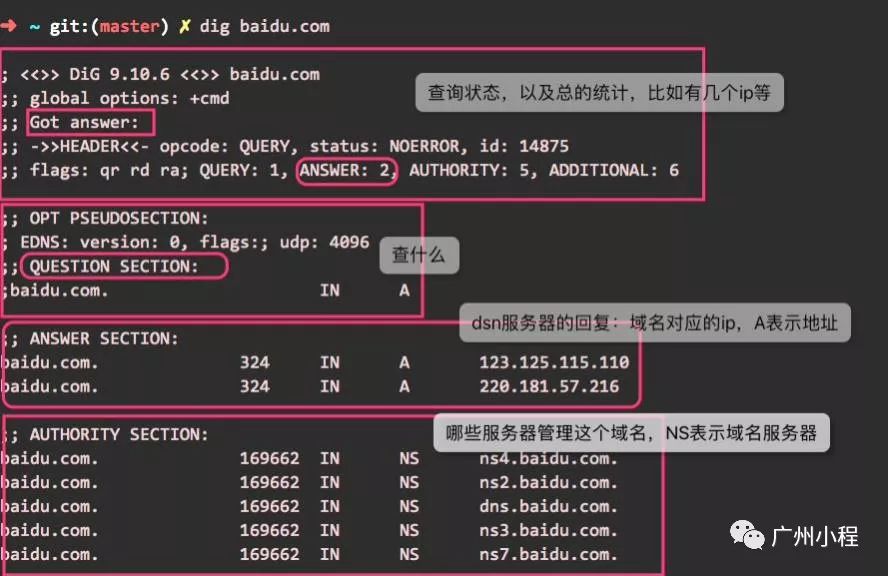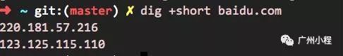 如果只是想简单地看到域名对应的ip,可以这样使用dig: