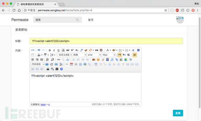 在注册账号完成并登陆之后,笔者再次打开发帖页面,并在标题处和内容处都填写payload,参考内容如下: