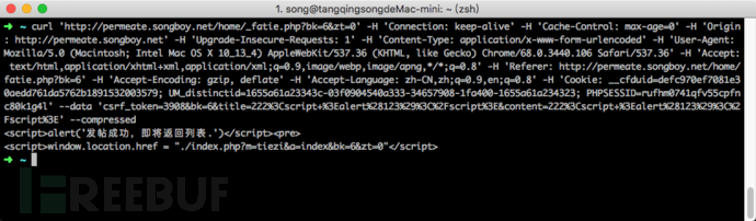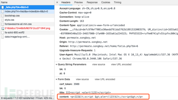 当标签被直接显示出来,这说明笔者的参数被转义了;转义分为两种,前端转义和后端转义,如果是后端转义通常笔者会放弃测试,如果是前端转义则可以绕过这个限制;在这里笔者发现标题没有被转义,而内容被转,猜测可能是前端做的转义,因此可以通过浏览器的审查工具将数据包拷贝下来;