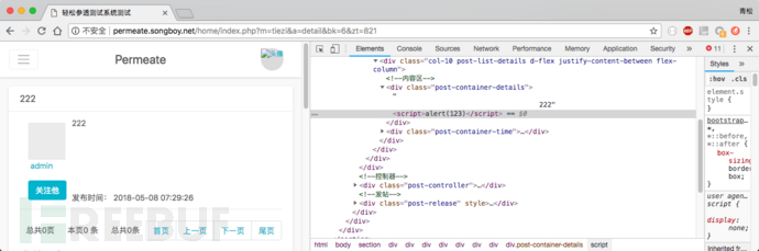 打开详情页,笔者被弹了两次提示框,说明标题和内容当中的payload都被触发,并且在控制台当中也可以看到script