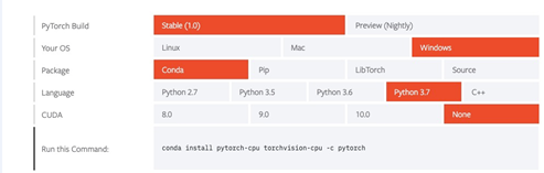 进入 PyTorch官网,依次选择你电脑的配置(我这里已经下载了python3.7),这里提供使用pip和conda两种环境下安装的步骤截图