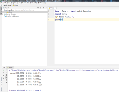 安装成功后检验是否安装成功,打开pycharm运行一个小demo: