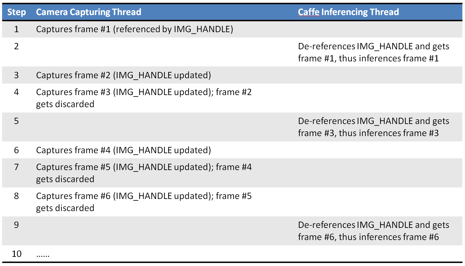 我使用一个全局变量 IMG_HANDLE 来引用图像帧,每当生产者(摄像机捕获线程)从相机获取新帧时,这个 IMG_HANDLE 就会更新。另一方面,每当消费者(caffe推理线程)准备处理下一个图像帧,它就取消对 IMG_HANDLE 的引用,从而总是获得最新的图像帧。