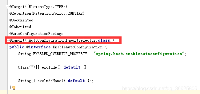 进入@EnableAutoConfiguration,看到一个@Import,点进去看,注释说明这是用来导入@Configuration的。