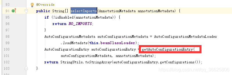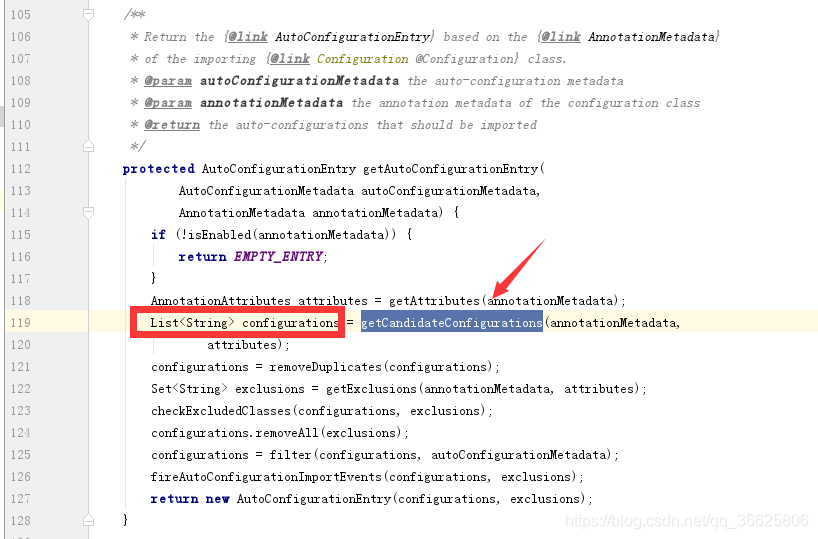 进入选择器AutoConfigurationImportSelector,可以看到它调用了一个获取自动装配实体的方法: