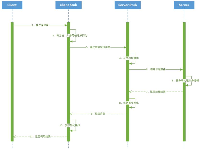服务端存根(Server Stub):接收客户端发送过来的请求消息并进行解包,然后再调用本地服务进行处理。