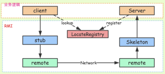 RMI 服务在服务端实现之后需要注册到 RMI Server 上,然后客户端从指定的 RMI 地址上 Lookup 服务,调用该服务对应的方法即可完成远程方法调用。
