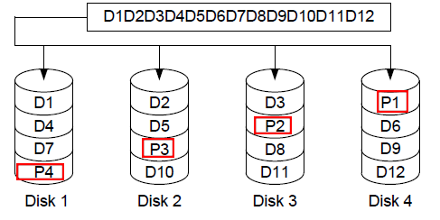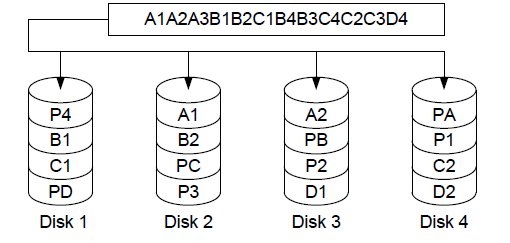 采用分布式奇偶校验的独立磁盘结构。数据校验的信息被均匀的分散到阵列的各个磁盘上,阵列的磁盘上既有数据,也有数据校验信息,数据块和对应的校验信息会存储于不同的磁盘上。