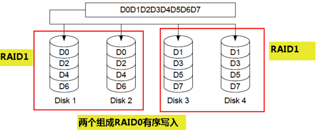 是一个RAID0与RAID1的组合体。RAID10的结构非常简单,首先创建2个独立的RAID1,然后将这两个独立的RAID0组成一个RAID0,当往这个逻辑RAID中写入数据时,数据被有序的写入两个RAID1中。