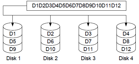 它将数据分成一定的大小,顺序地写到阵列的磁盘里。如下图所示: