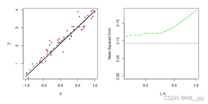 图3.10。对图3.9所示的相同数据集进行了进一步研究。左:蓝色虚线是数据的最小二乘拟合。由于f(X)实际上是线性的(显示为黑线),最小二乘回归线提供了对f(x)的很好估计。右:水平虚线代表线性回归的测试集MSE,而绿色实线对应于KNN的MSE,作为1/K的函数(在对数刻度上)。与KNN回归相比,线性回归实现了更低的测试MSE,因为f(x)实际上是线性的。对于KNN回归,最佳结果出现在K值非常大的情况下,对应于1/K的最小值。