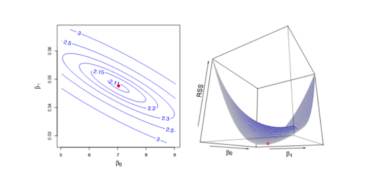图3.2 RSS的等高线图和三维图以advertising数据集为案例,使用Sales作为Y,TV作为X。红色的点对应于给出的最小二乘估计值